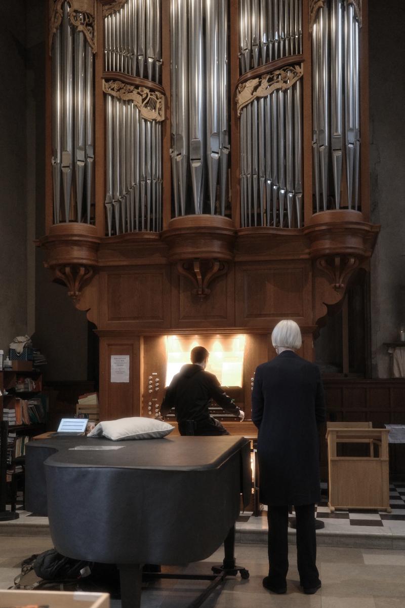 In St Giles Church near Barbican, London. A young man is learning to play the organ, with his teacher standing behind.