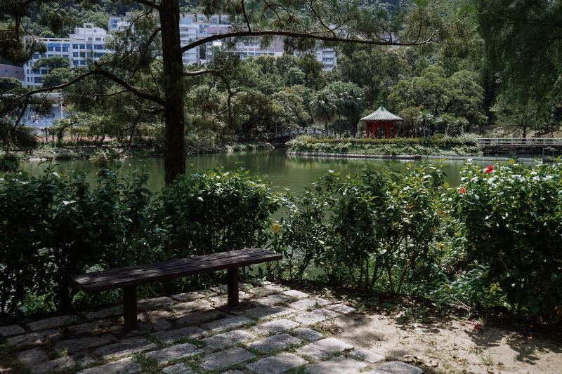 未圆湖边长椅,湖对岸是狮子亭。