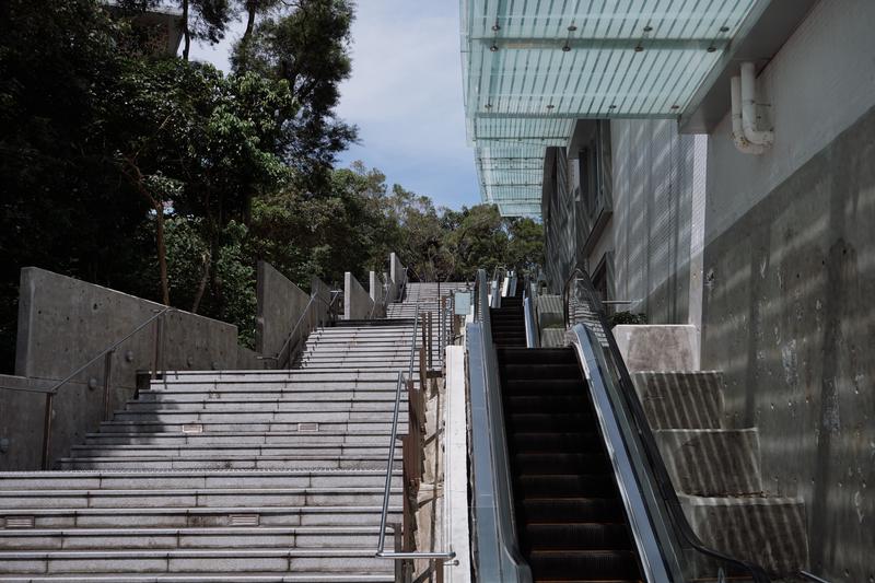 伍何曼楼下的一串扶梯。从YIA广场通向何草。