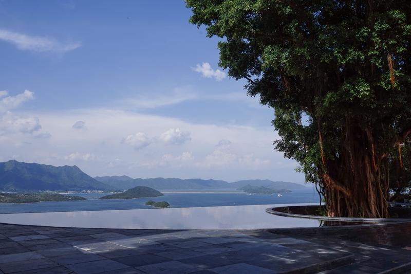 站在狮子亭一侧,望向未圆湖。远处白色的建筑物是康本国际学术园。图片的右边一角红色是岭南体育场。