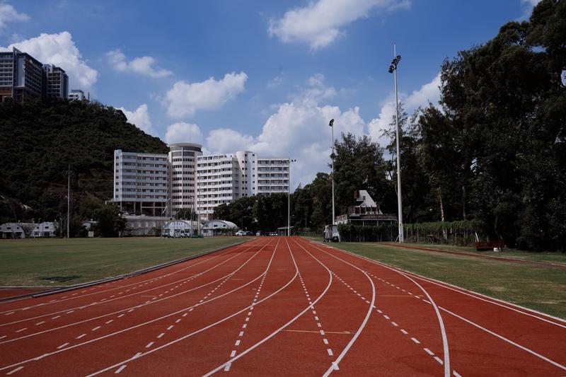 夏鼎基运动场。跑道尽头两个矮小的篷子是大学健身房,再远处的建筑是研究生宿舍一座。
