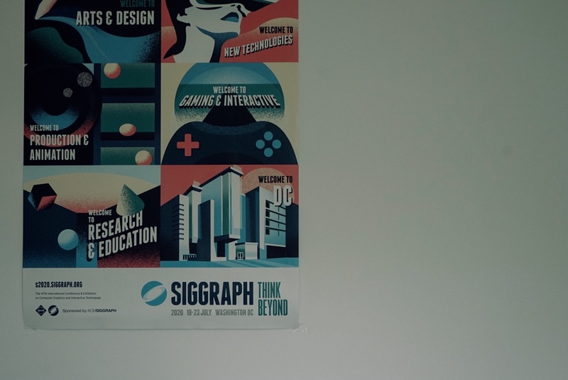 A poster of SIGGRAPH 2020, which was held in Washington DC, United States. It shows five interest areas of SIGGRAPH.