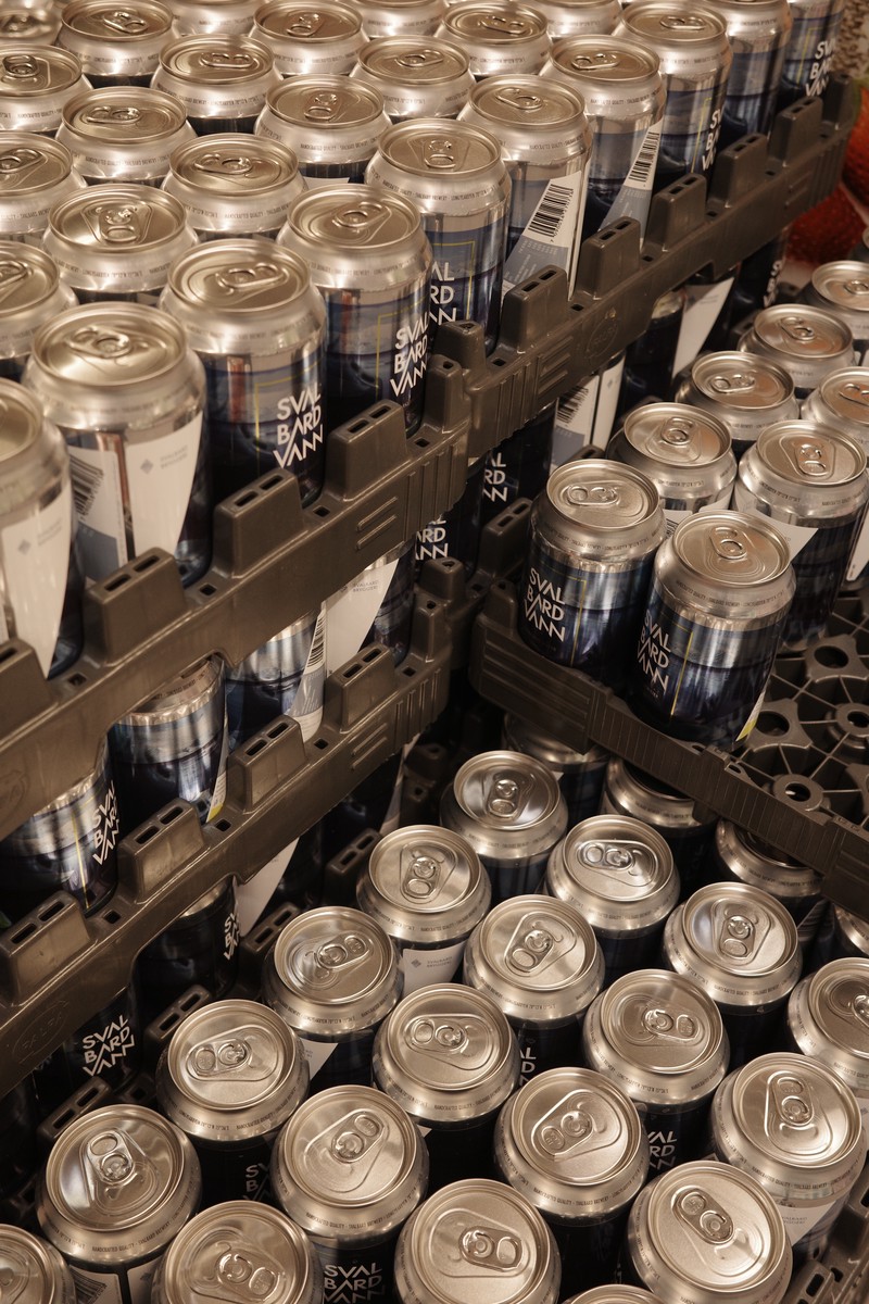 作为世界最北的超市,他们少不了要彰显一下自己的本地特色。超市入口的购物车上展示着朗伊尔城的夜景。超市内有一些明信片之类的纪念品,还有本地的罐装饮用水。虽说每一瓶都来自于本地的冰川化雪,也因此价格不菲,但是味道却和别的水一样别无二致。