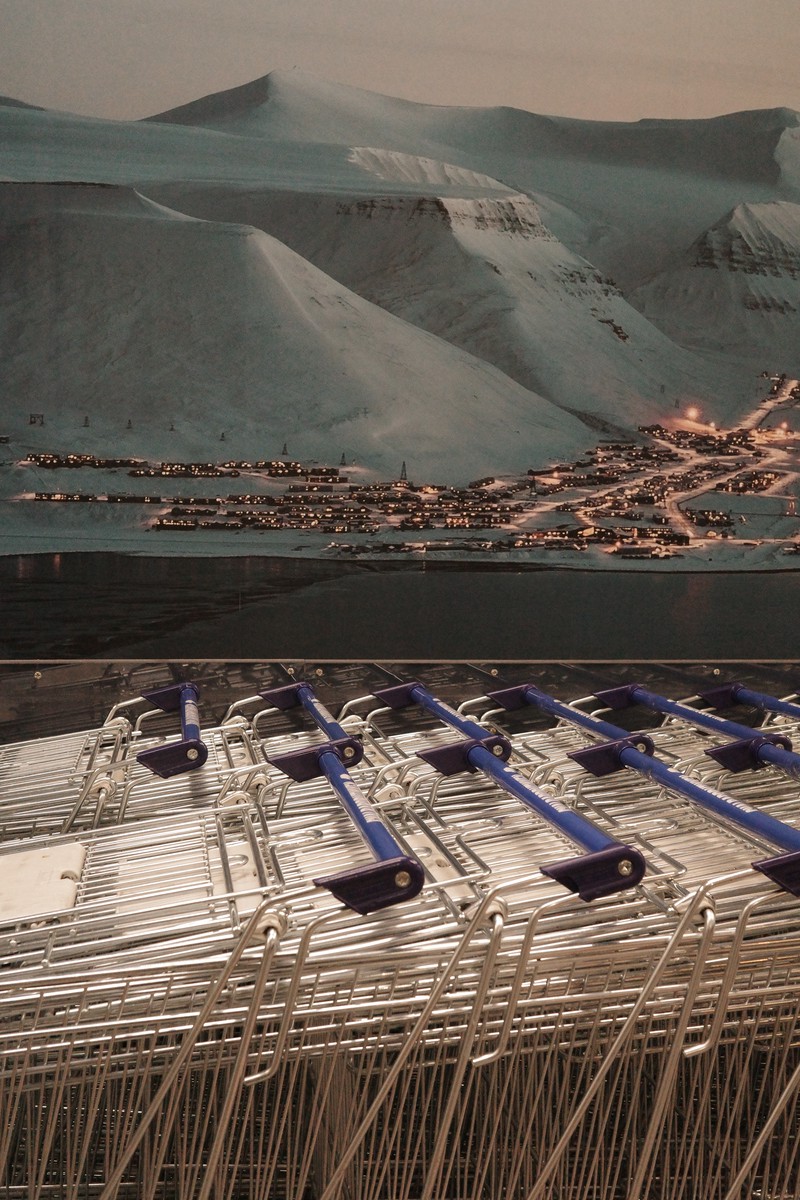 超市入口处的购物车,上面是朗伊尔城空中俯瞰视角的照片
